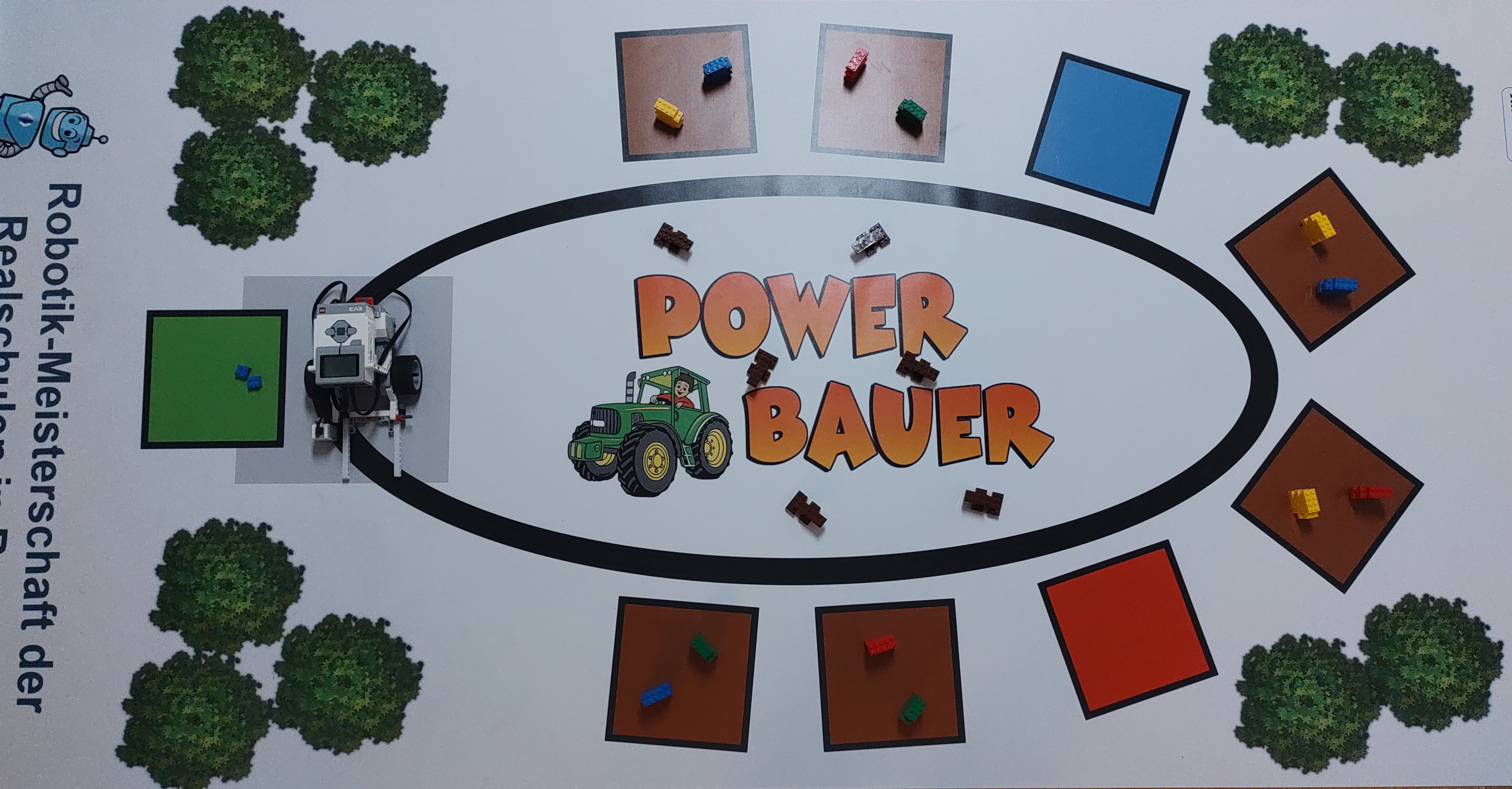 Der Roboter soll Holz aus dem Wald holen und zum Sägewerk bringen. Die jungen Bäume darf der Roboter aber nicht beschädigen. Außerdem brauchen die Tiere wieder Wasser auf der Weide. Eine schwarze Linie hilft dem Roboter, den Weg zu den Holzstapeln, zum Sägewerk und zur Tierweide zu finden.