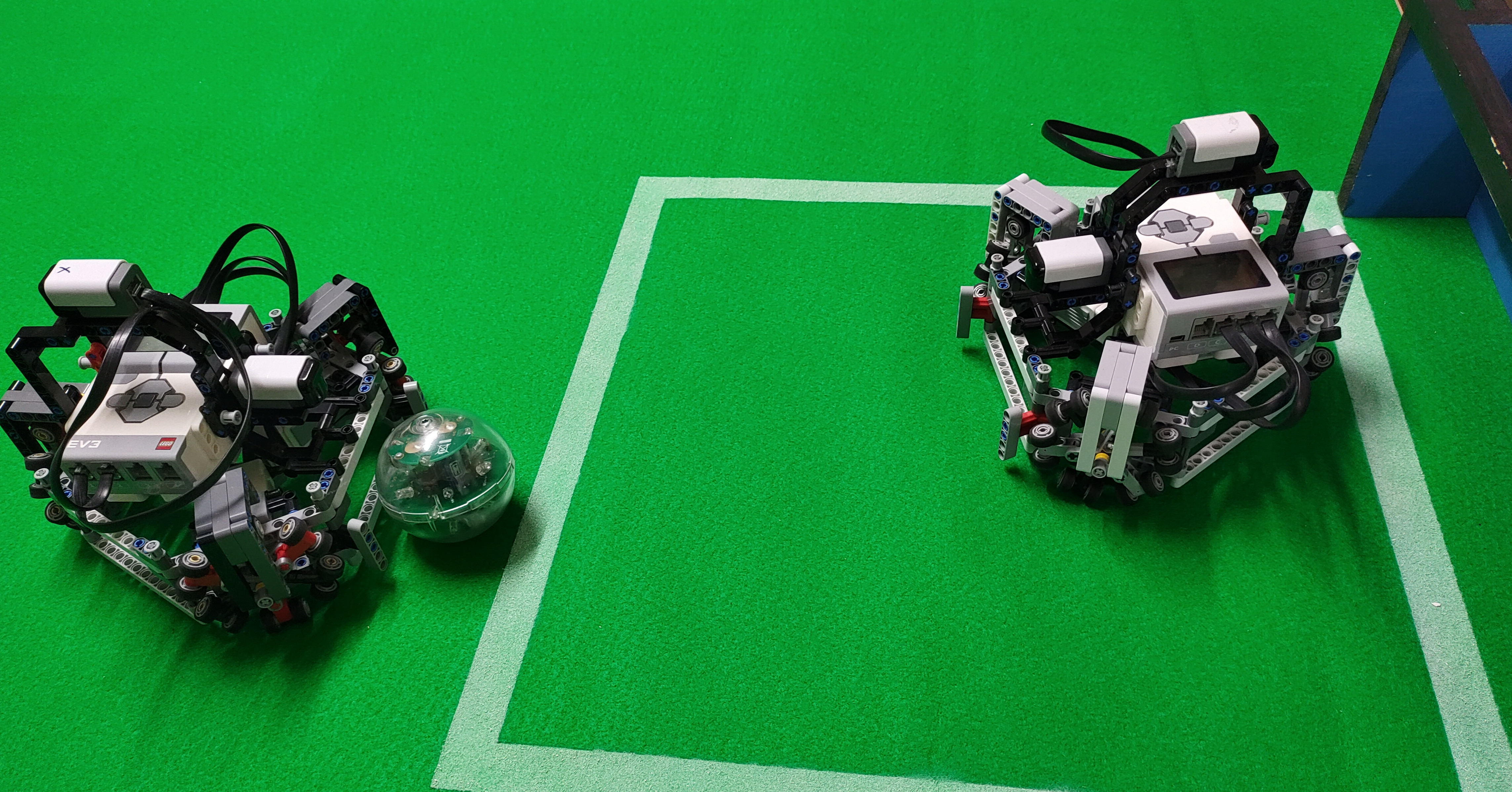 Zwei Roboter spielen gegeneinander Fußball. Der Roboter, der mehr Tore schießt, gewinnt.