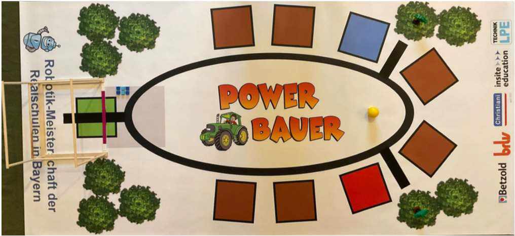 Der Roboter soll einen Siloballen in die Scheune transportieren, bearbeitete Felder bewässern und Bäume fällen. Eine schwarze Linie hilft dem Roboter, den Weg zu den Feldern und zurück zum Bauernhof zu finden. Die Scheune und den Sockel für die Silokugel darf der Roboter aber nicht beschädigen.